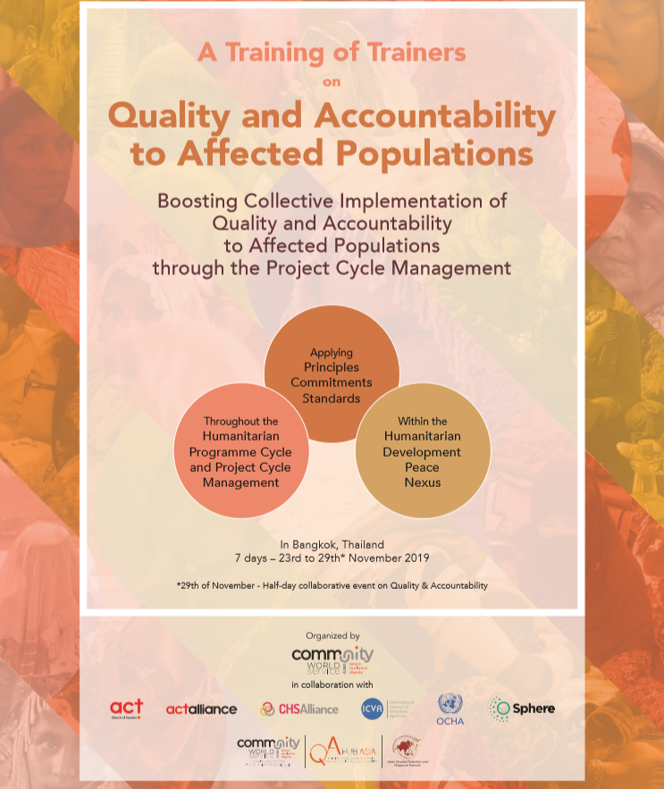 Community World Service Asia is organizing a regional learning event on “Quality and Accountability to Affected Populations” from November 23 to 29, 2019 in Bangkok, Thailand. This event is a [...]