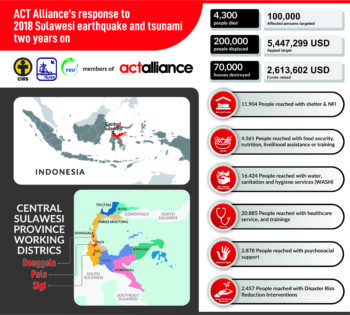 ACT Alliance members Yakkum Emergency Unit (YEU), Indonesian Christian Association for Health Service (ICAHS/PELKESI) and Church World Service (CWS), with their partners coordinated, their responses through the ACT appeal, targeting 100,000 vulnerable people affected by the earthquake and tsunami. All three organisations supported the Sigi district in Central Sulawesi, which had one of the highest numbers of casualties caused by mudflows and liquefaction after the earthquake. Several aftershocks damaged more buildings and houses causing even more people to become homeless.